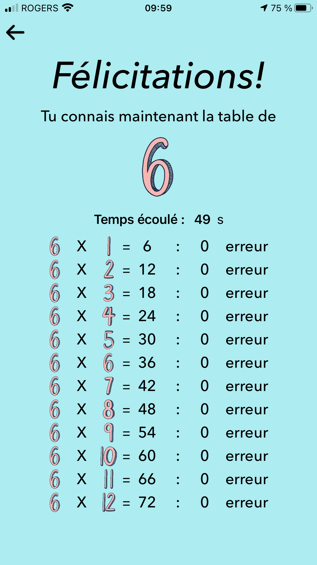 Quand votre enfant saura sa table, l’application affichera les statistiques démontrant sur quelles multiplications les erreurs ont été faites pour vous donner une idée du travail que votre enfant a accompli.