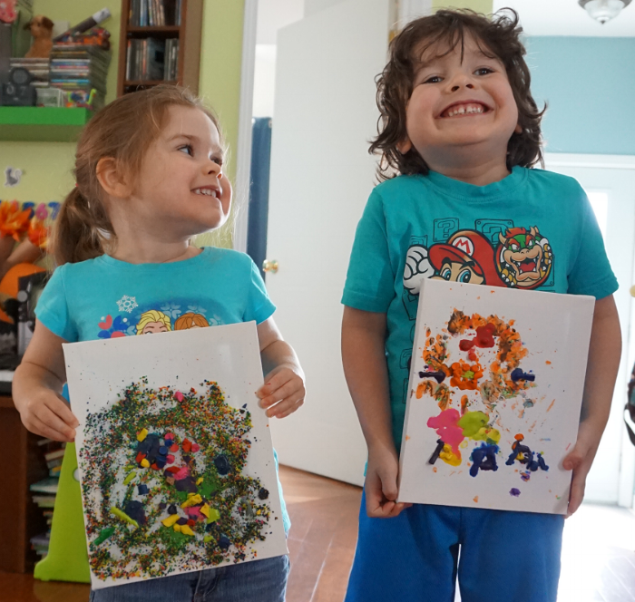 5. Pour l’œuvre de mon fils se fut un plus difficile malgré le fait que les deux toiles étaient côte à côte. Selon moi, cela s’explique par le fait qu’ici nous mélangeons toutes les sortes de crayons de cire dans un grand contenant. Certaines sont plus « plastique » que « cire » selon la marque. Je crois donc que pour un résultat optimal, utilisez de véritables crayons de cire de marque « Crayola » fonctionne mieux.