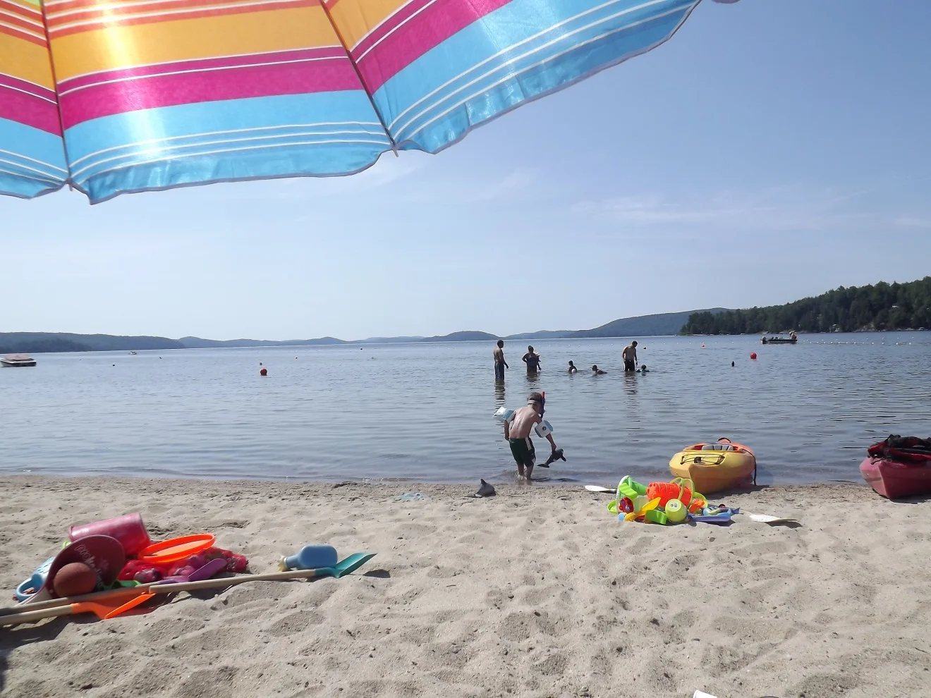 Le weekend du 14 juillet dernier, alors que le Québec était frappé par une vague intense de chaleur, nous, nous étions en pleine découverte assez rafraîchissante du Centre Touristique du Lac Simon. Imaginez! Deux kilomètres de plage sablonneuse avec une eau claire dans laquelle les enfants pouvaient plonger pour trouver de petits coquillages et s’aventurer sur plusieurs mètres sans danger de perdre pied … quel bonheur!