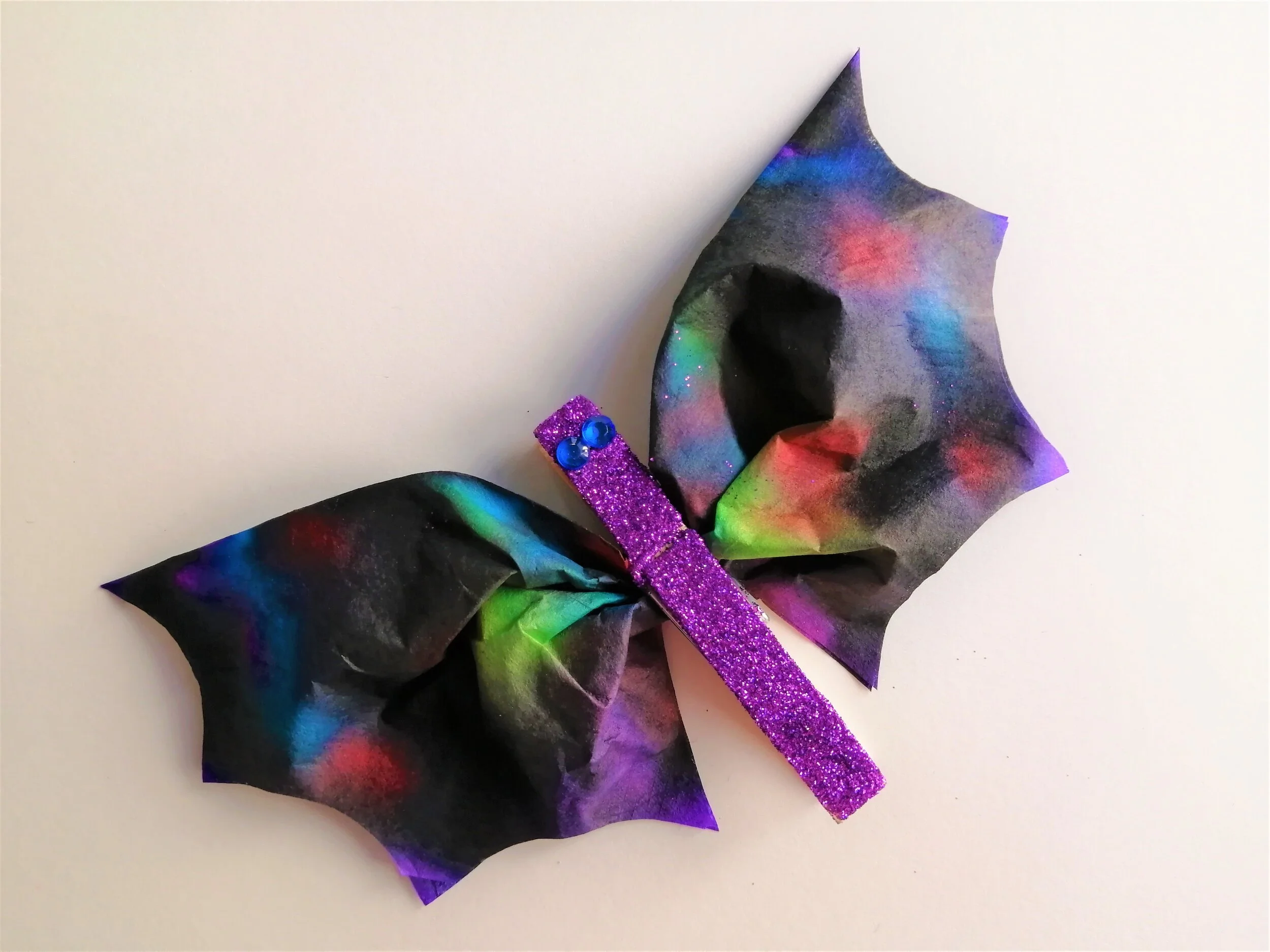 7. Il ne vous reste plus qu’à pincer le centre de votre filtre à café de façon à créer les ailes et à y installer l’épingle à linge.
