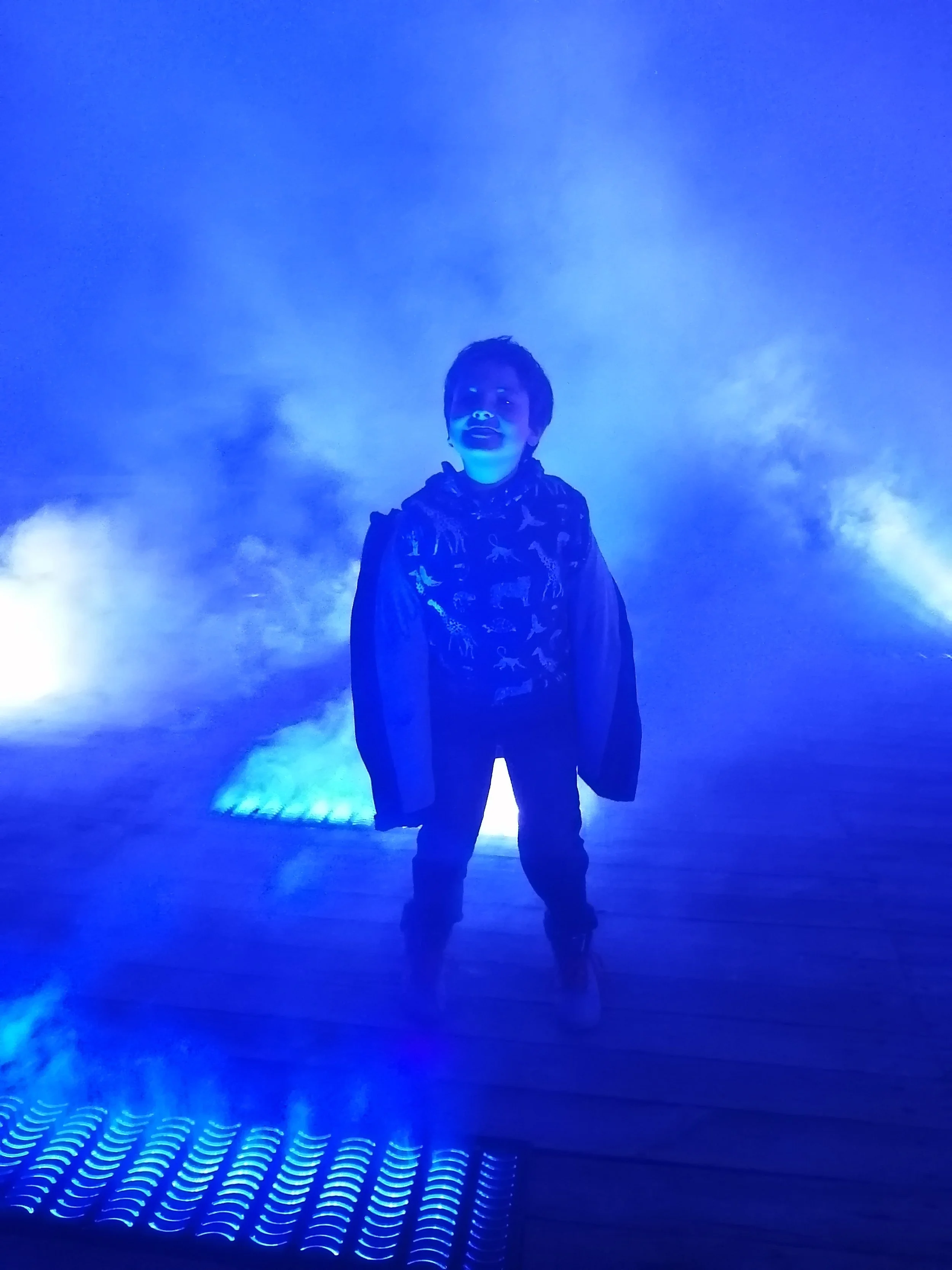 On se promène dans les sentiers en suivant des pistes éclairées de notre lampe de poche spéciale. Découvrant ici et là des projections grandioses, des rayons lumineux, de la fumée colorée et plus encore. Tout cela dans une ambiance musicale magique.